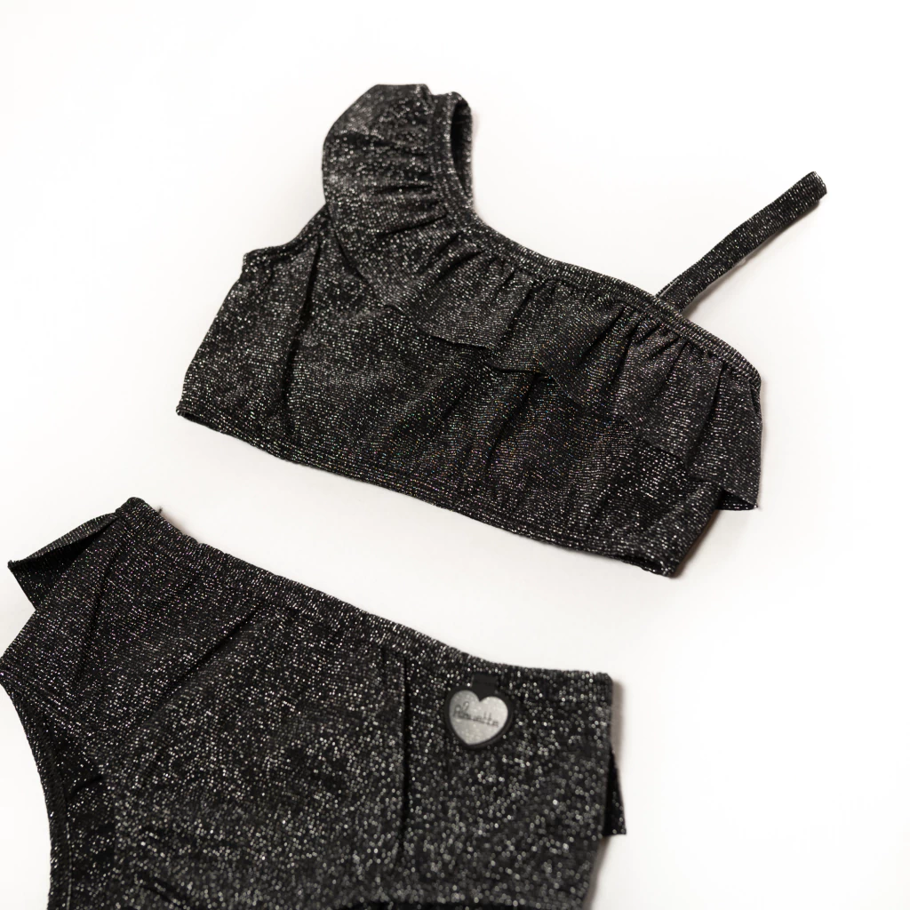 Bikini tricot top con un hombro y bombacha con volado en la cola. Tela CON LUREX. Una bikini que es fuego total, un infaltable para este verano.