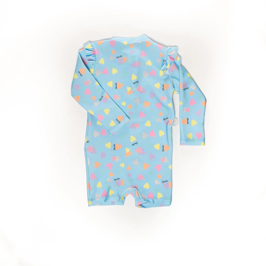 ENTERITO con filtro UV CERTIFICADO CORAZONES. Una estampa super dulce y detalles que vas a amar. Voladitos en los brazos, cierre en el frente.